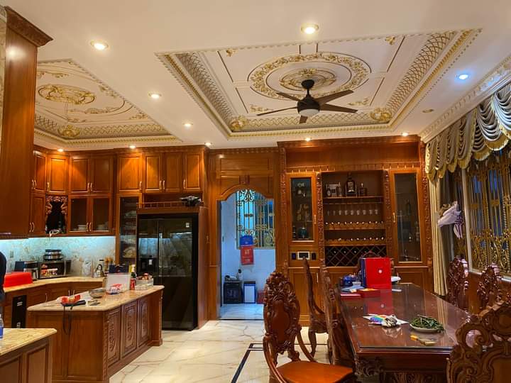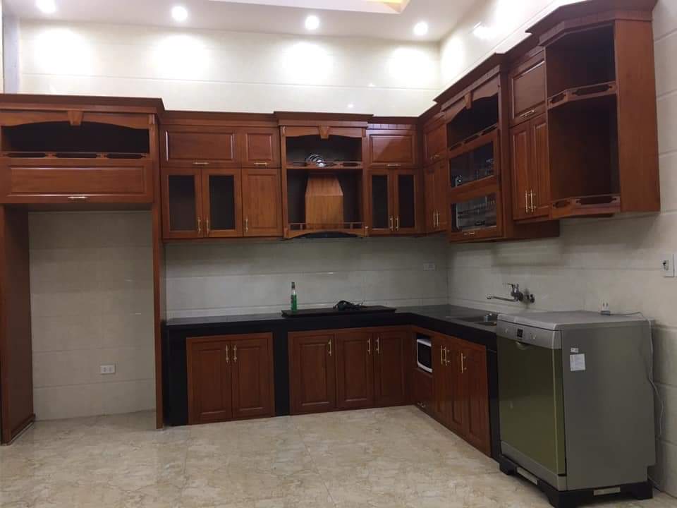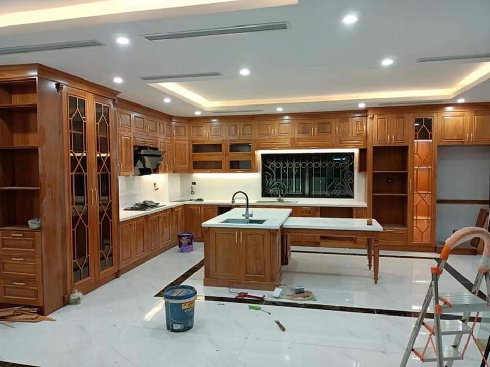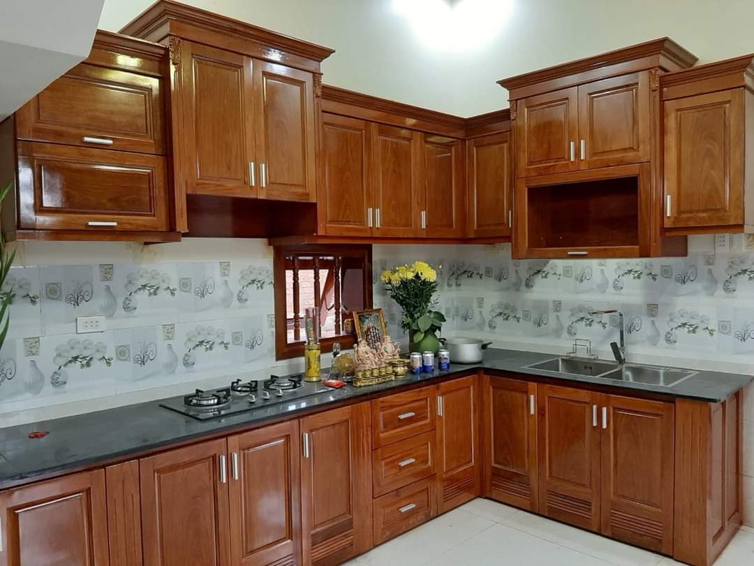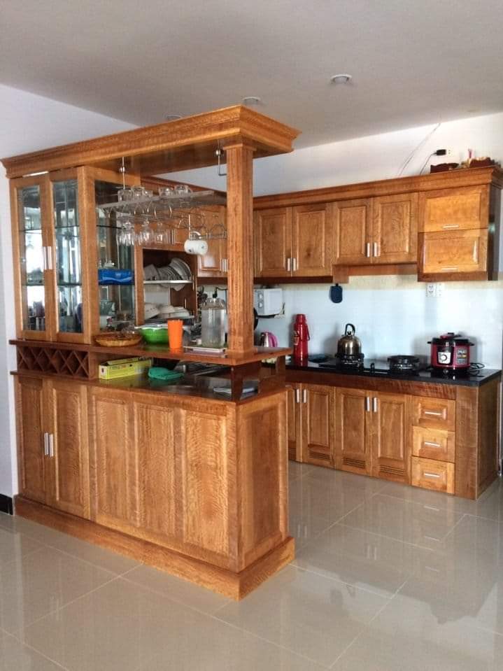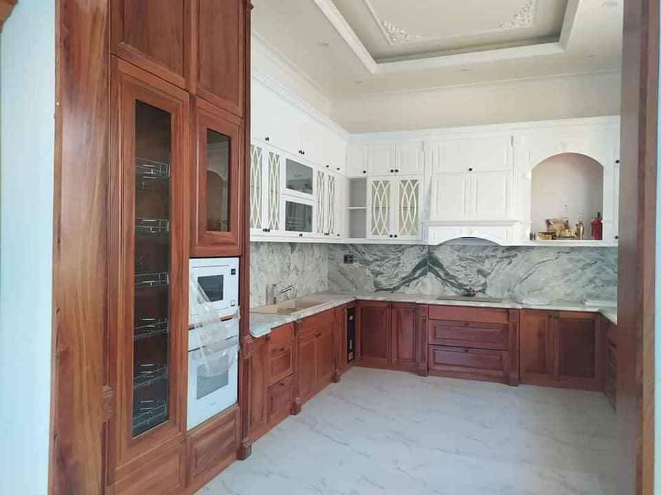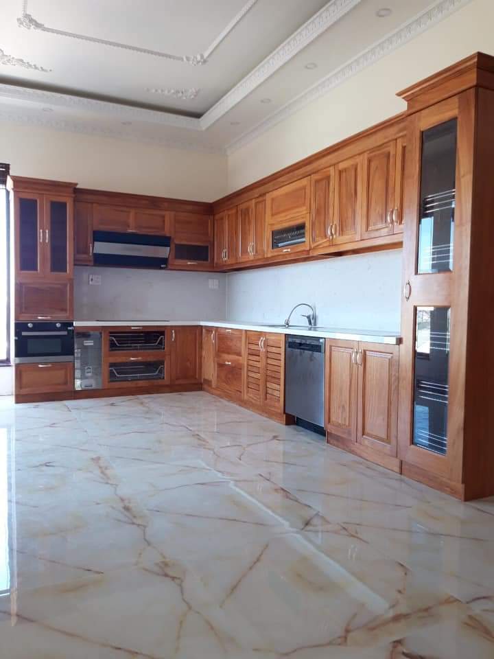 - Tủ bếp gỗ tự nhiên kết hợp với đá granite, mang lại vẻ sang trọng và đẳng cấp.