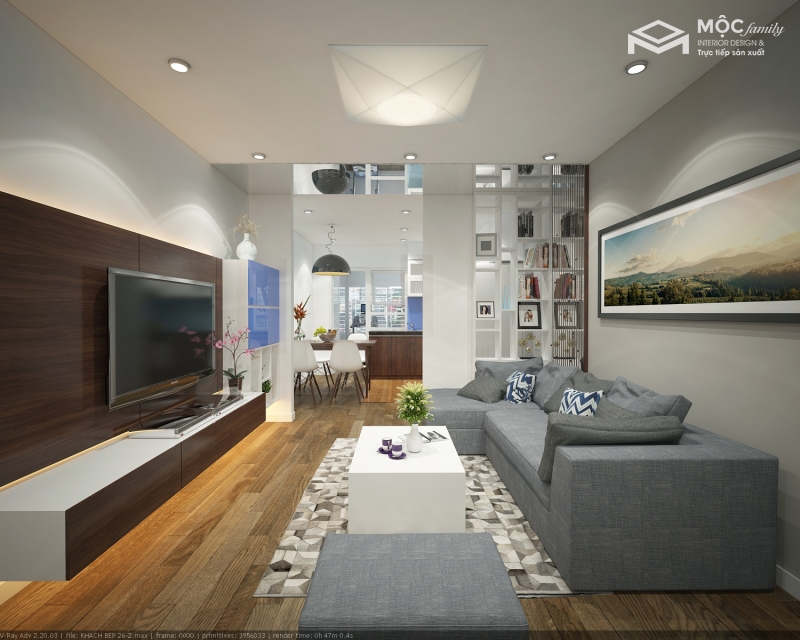 Phòng khách sẽ được bày trí với bộ sofa màu xám cùng bàn uống nước màu trắng đơn giản. Phần kệ tủ TV sẽ được thiết kế theo phom hình chữ nhật nhỏ gọn. Để tô điểm thêm cho phòng khách, Mộc Family đã thiết kế thêm phần kệ tủ trang trí. Phần kệ tủ dưới là các ngăn chứa rộng rãi có cánh tủ giúp bạn cất giữ đồ đạc gọn gàng. Phần tủ trên được thiết kế rỗng để bày đồ trang trí như tranh ảnh, lọ hoa,...