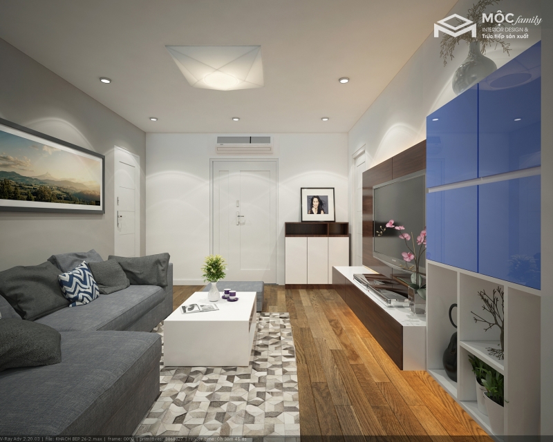 Dự án này thi công thiết kế các đồ nội thất cho phòng khách. Sau khi bàn bạc và trao đổi với khách hàng, đội ngũ kiến trúc sư của Mộc Family đã nắm bắt được ý tưởng của khách. Phòng khách sẽ được thiết kế theo phong cách hiện đại, thanh lịch và trẻ trung. Các đồ nội thất cơ bản gồm có bàn ghế, kệ TV và kệ tủ trang trí.